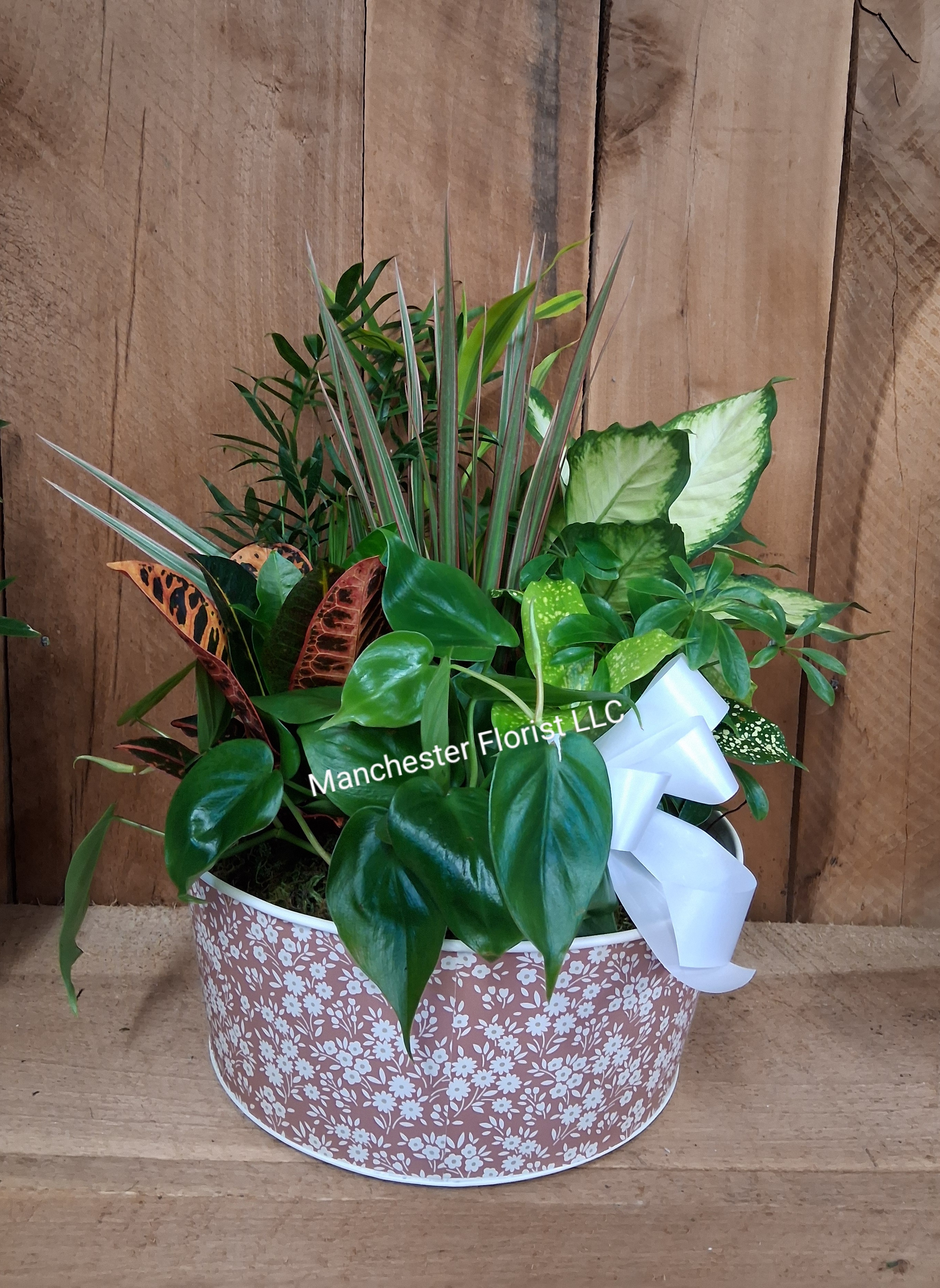 A 12″ tin filled with house plants. Includes bow and butterfly.