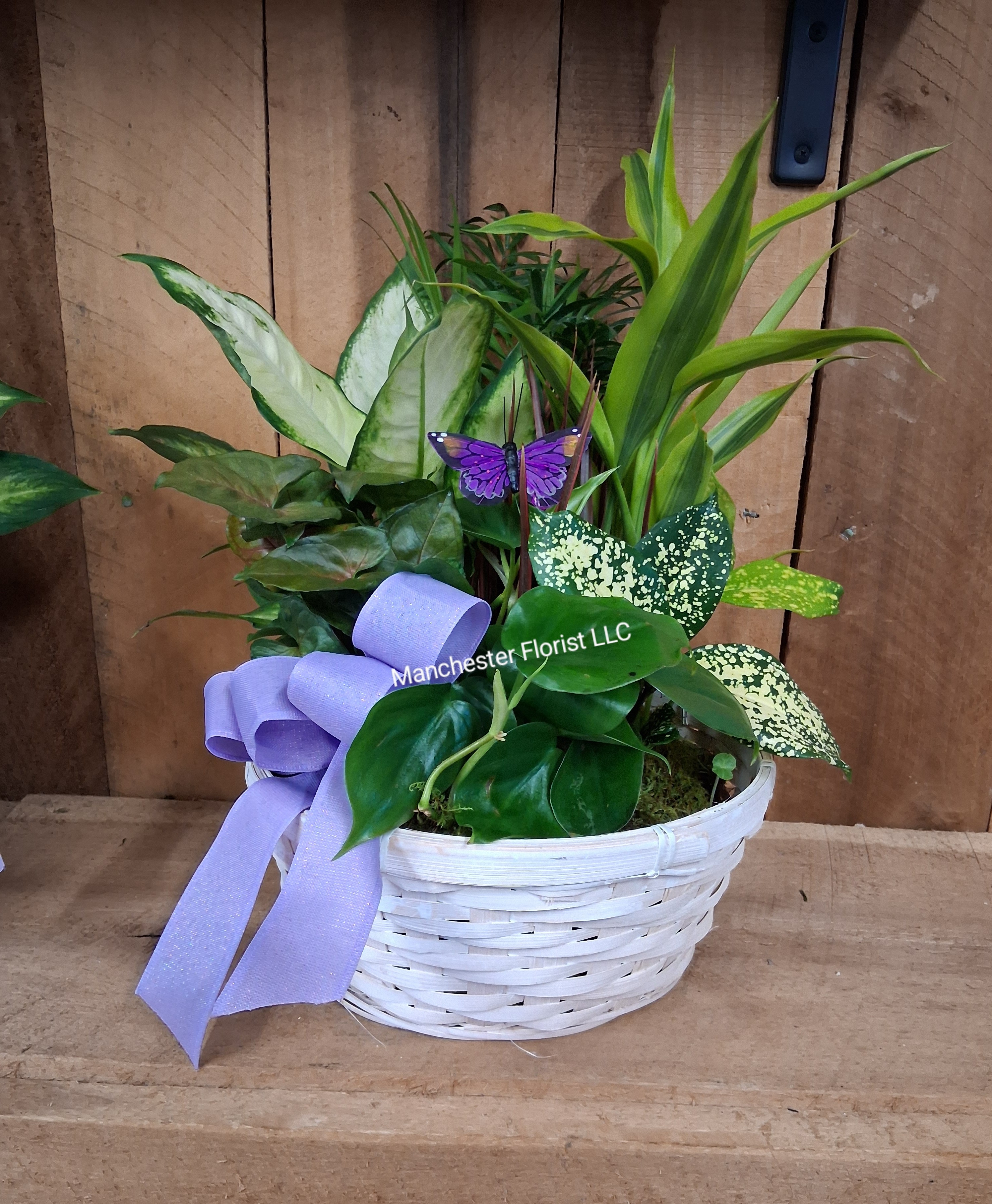 A 10″ basket filled with house plants. Includes bow and butterfly.