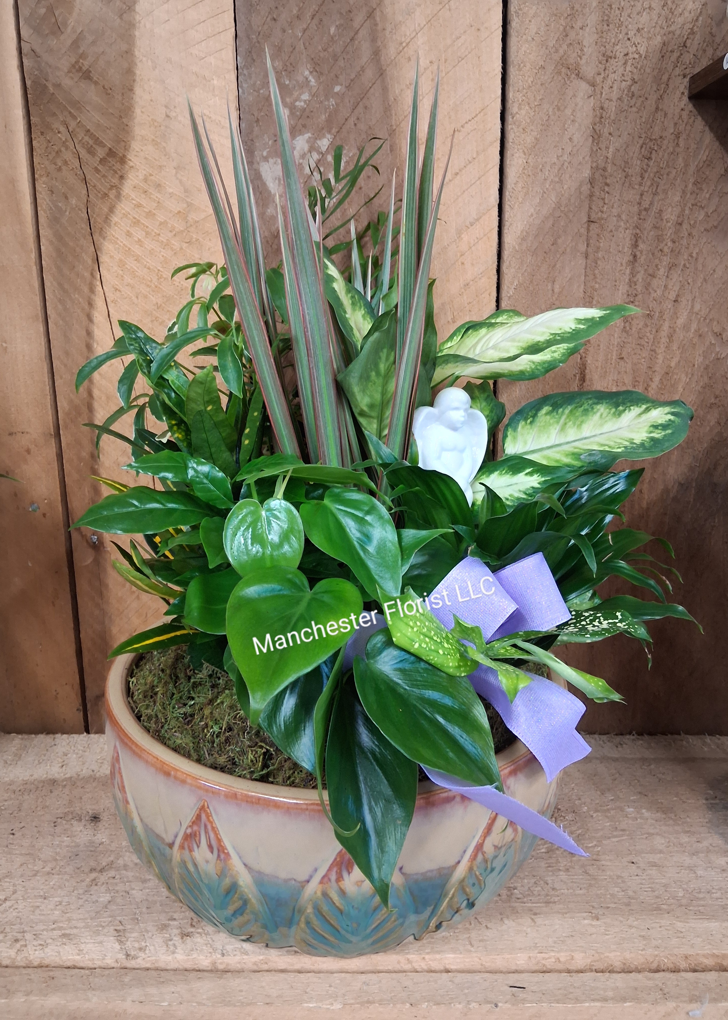 A 12″ ceramic container filled with house plants. Includes bow and butterfly.