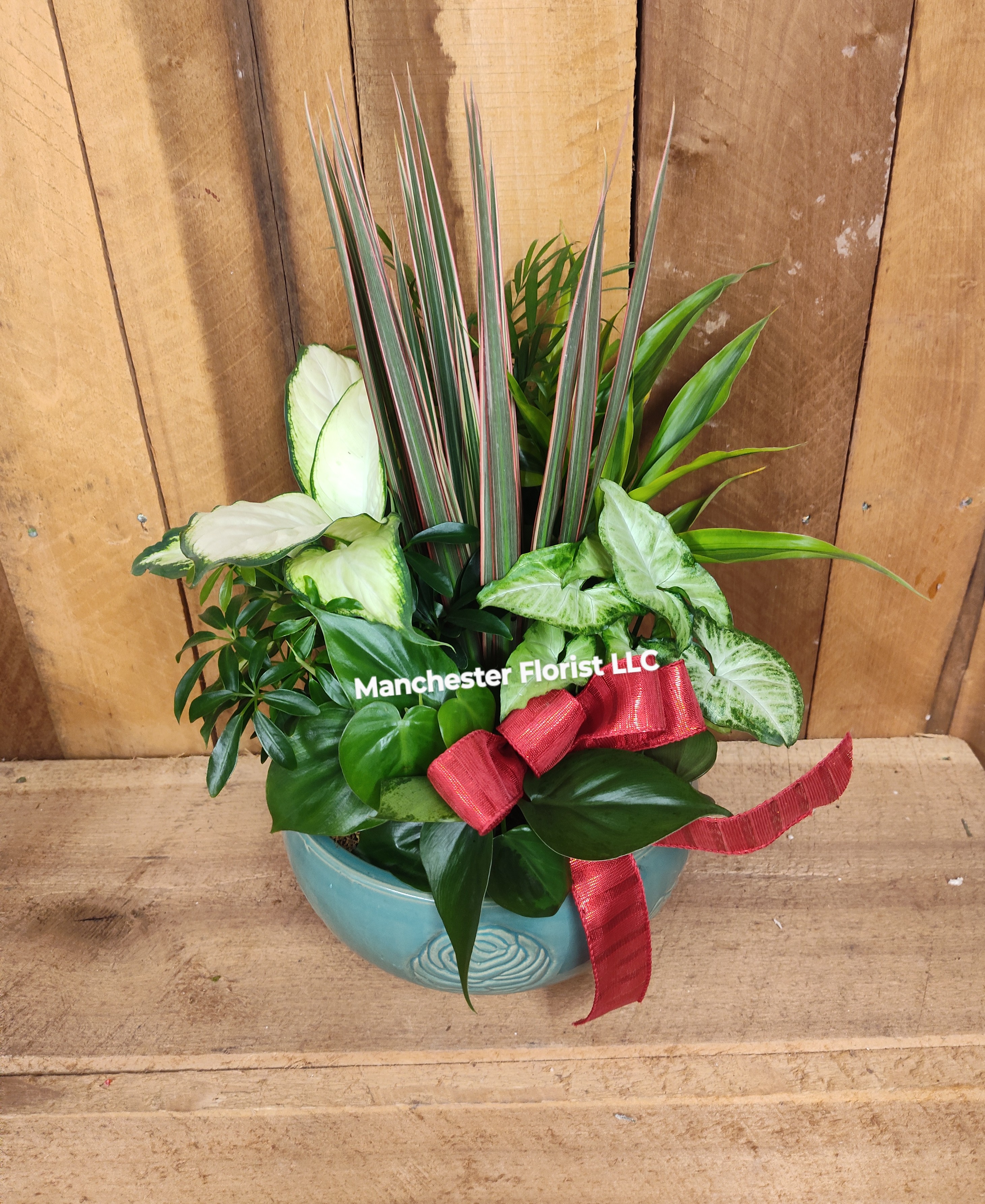 A 10″ ceramic Dish Garden- has 5-6 planted houseplants.