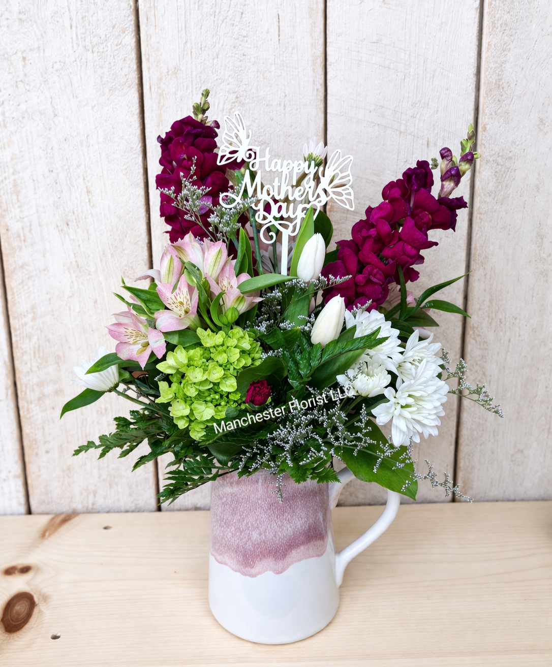 A mix of green hydrangea, white daisies, pink alstroemeria, purple snapdragons, white tulips, mixed filler and greens in a pink and white ceramic pitcher.