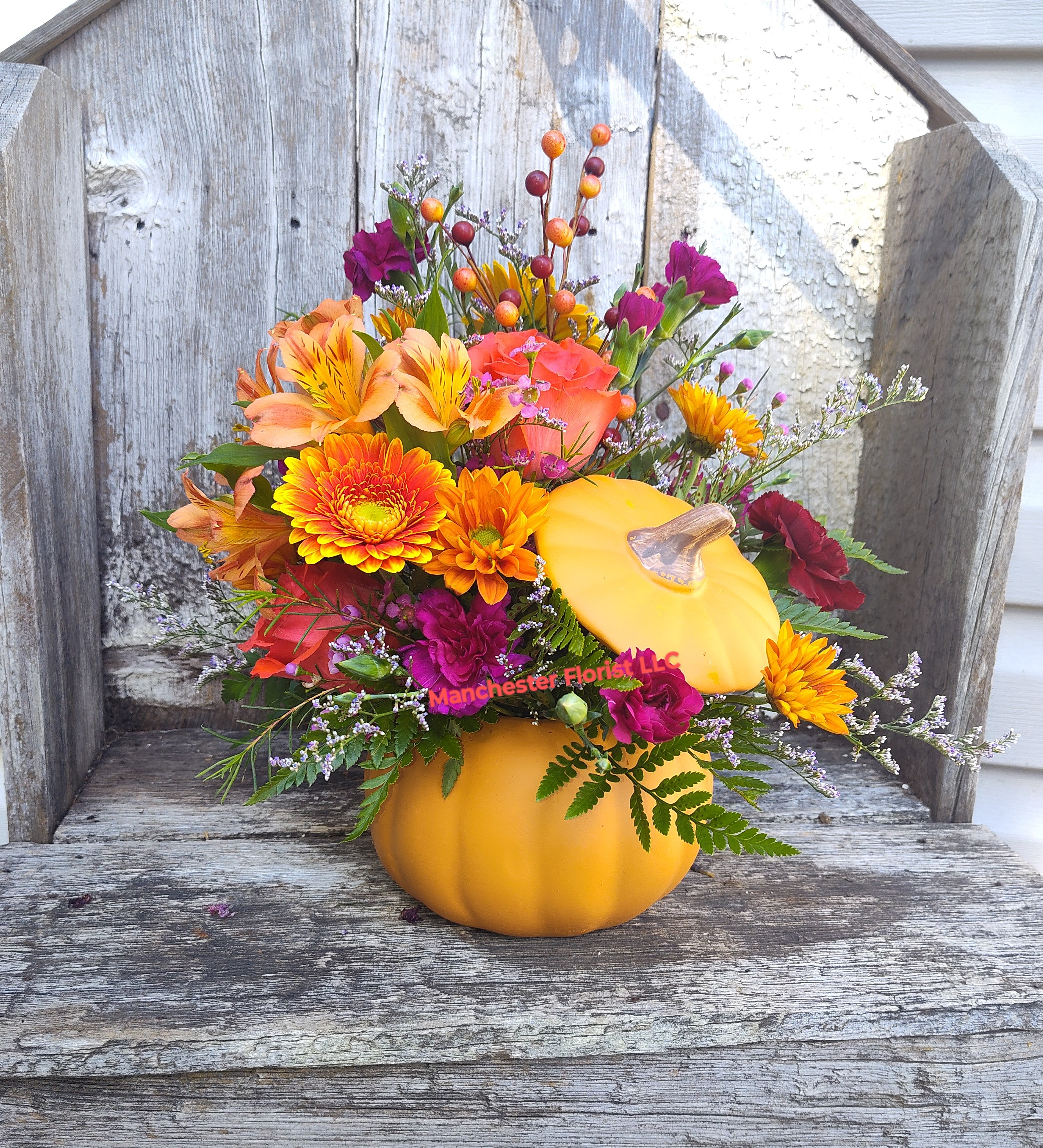 A fall seasonal mix in an orange pumpkin. Colors and flowers may vary based on availability.
