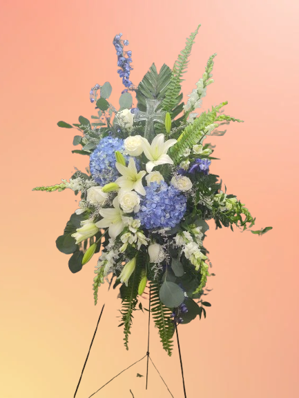 Large standing spray with blue hydrangea, white snapdragons, white roses, white alstroemeria, white lilies, blue delphinium, mixed filler and greens. Includes Glass Cross Keepsake.