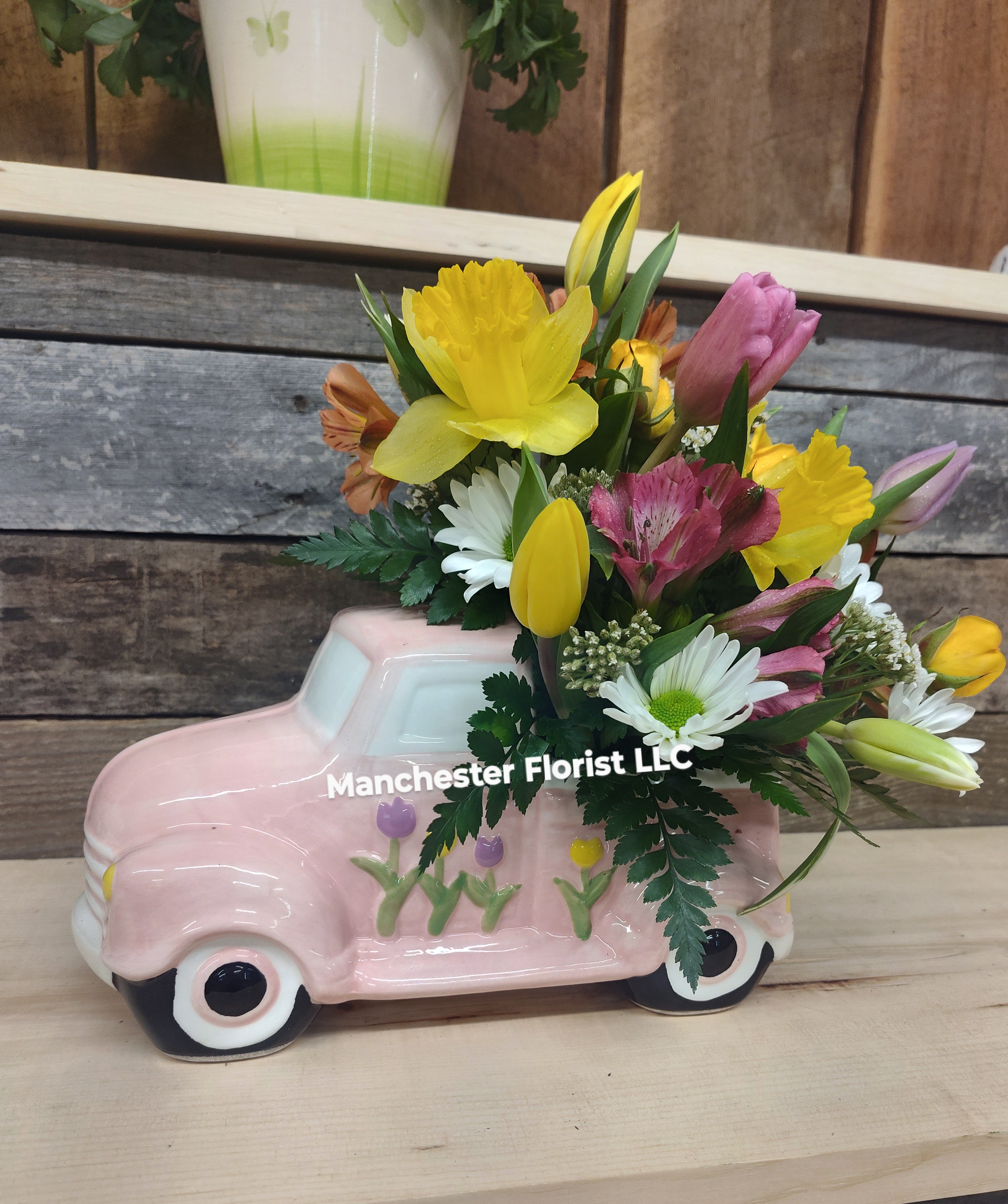 A spring mix of seasonal flowers in a pink ceramic truck.