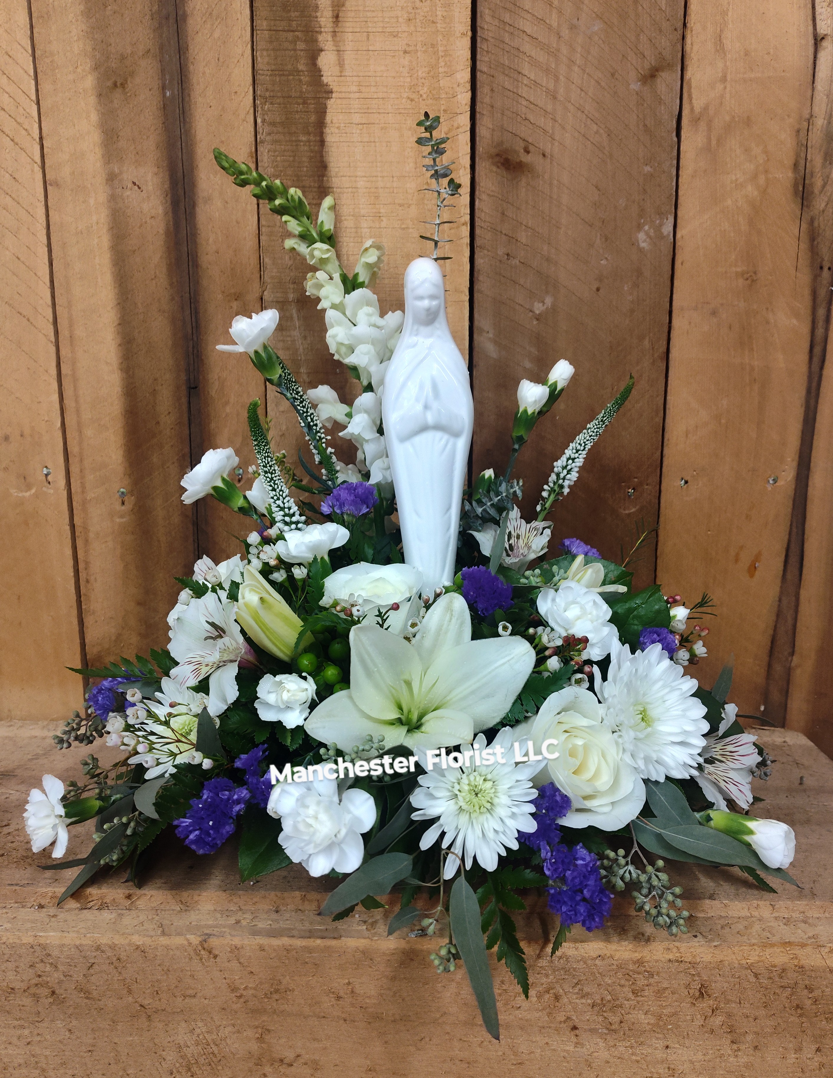 A mix of white lilies, white roses, white cushion mums, white veronica, white carnations, mixed filler and greens.