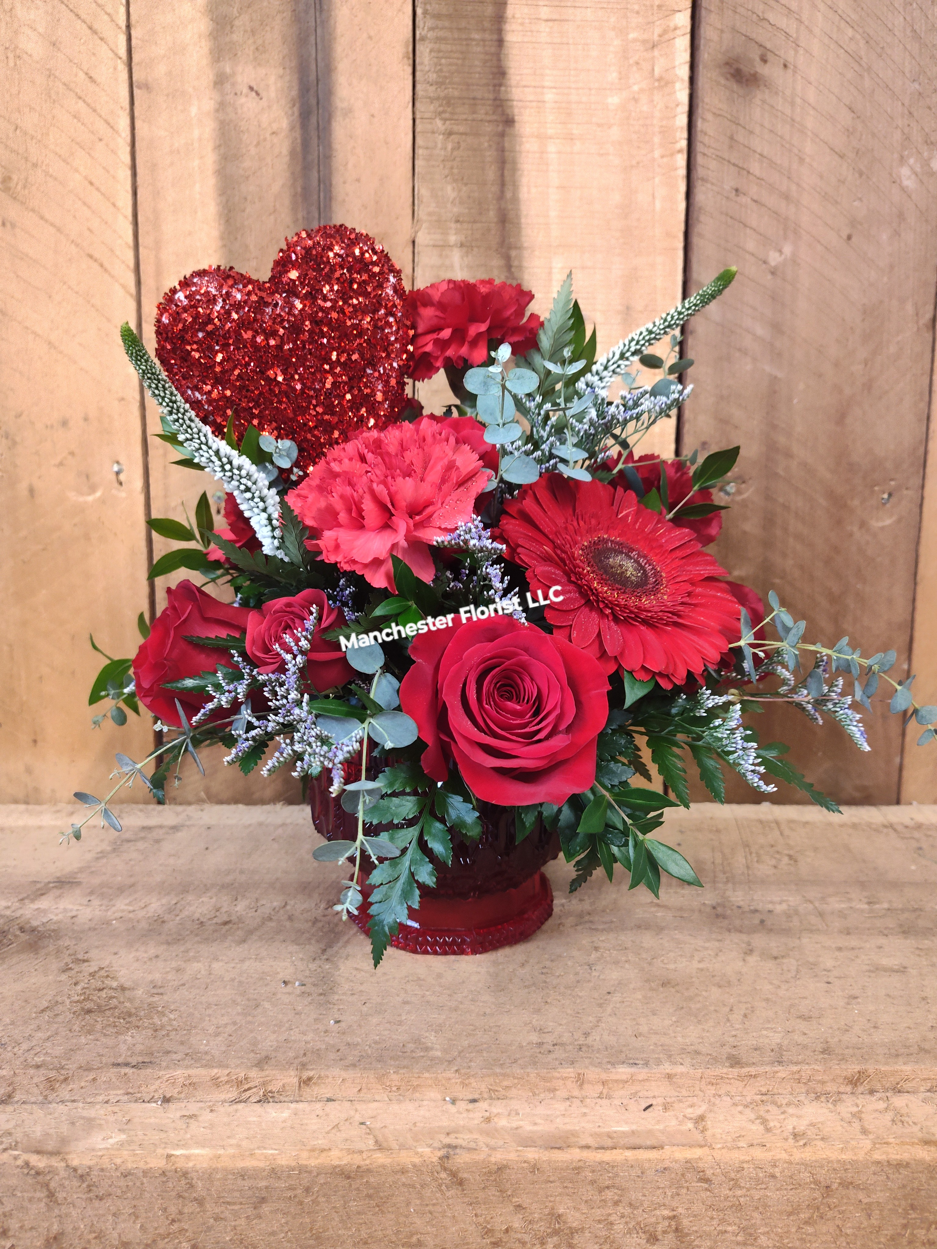 A mix of red roses, red carnations, red gerbera daisies, white veronica, mixed filler and greens in a plastic red centerpiece container. Includes heart pic.