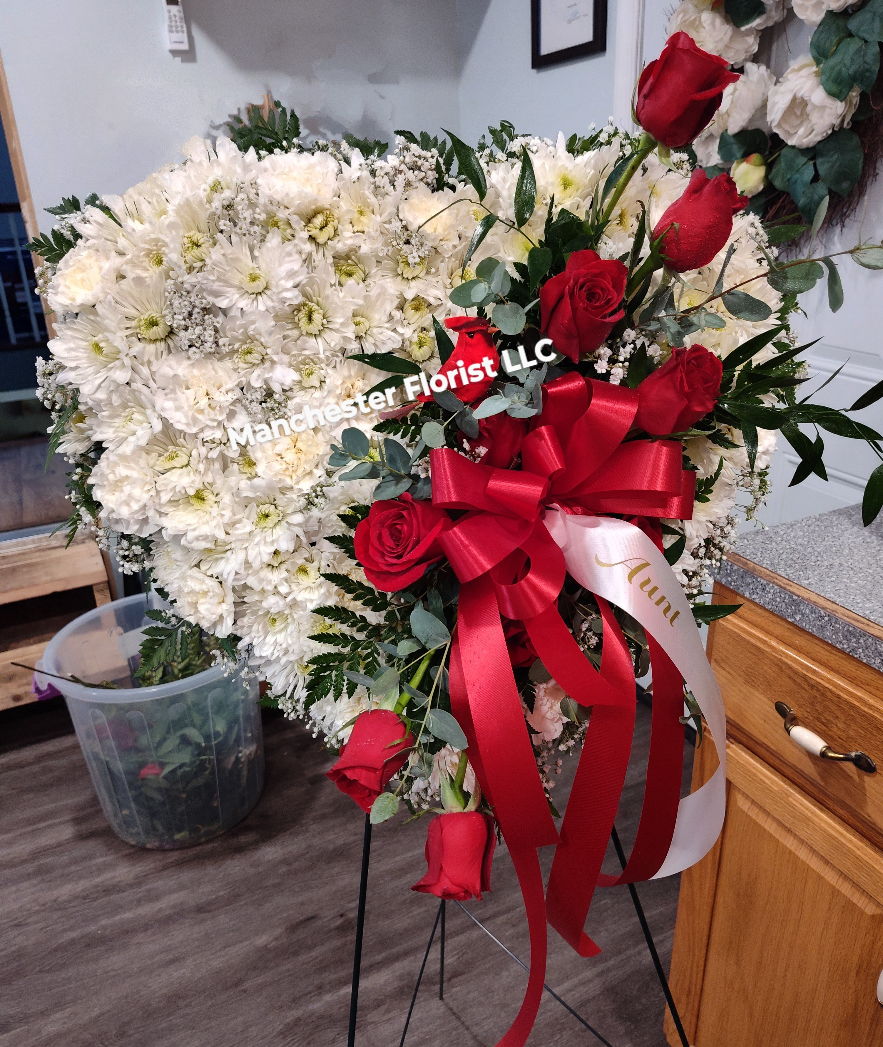A standing heart with white cushion mums, babies breath and greens, with red roses and a red bow brake.