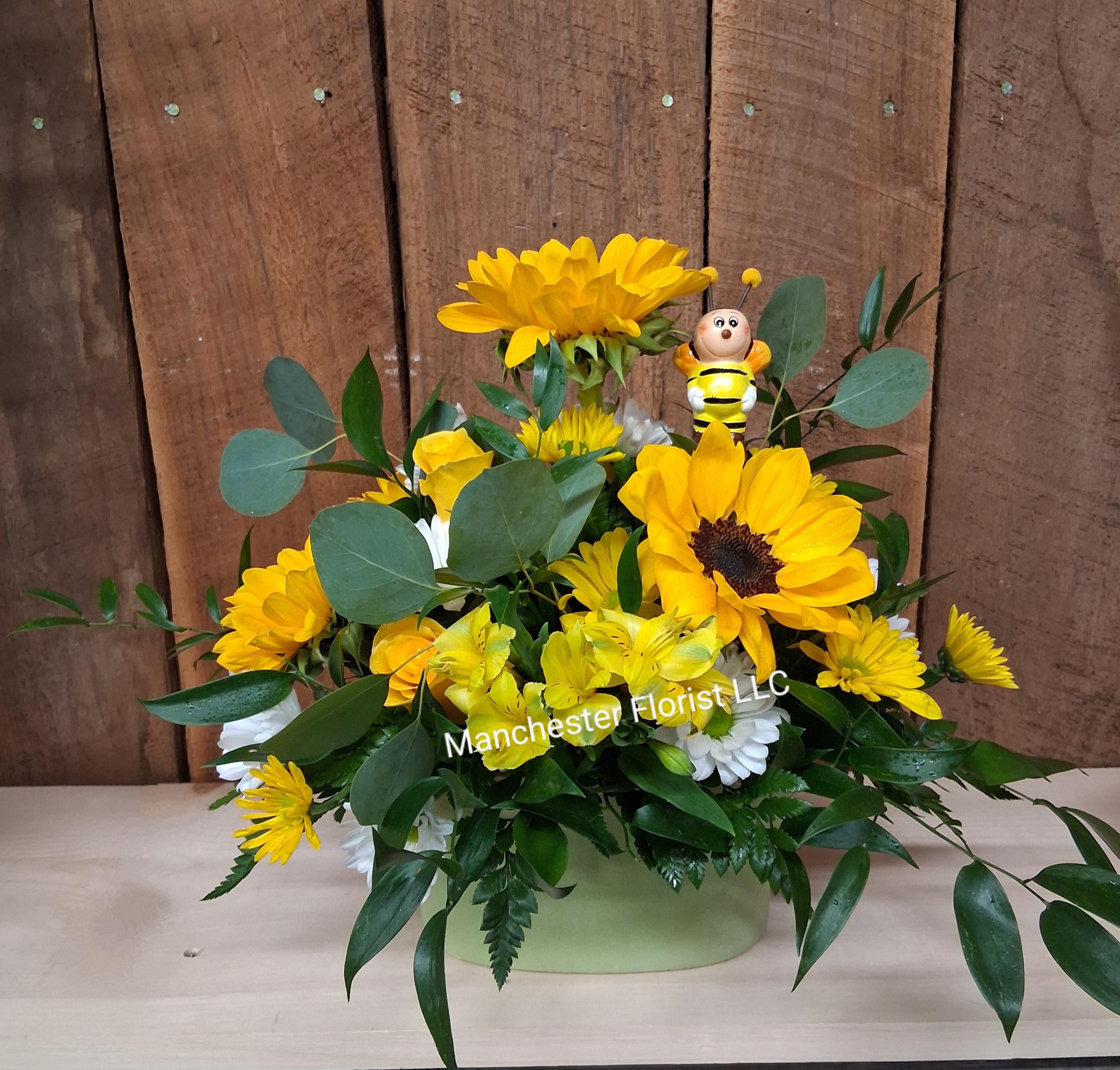 A mix of sunflowers, yellow alstroemeria, white daisies, yellow daisies and mixed greens in a plastic oval container.